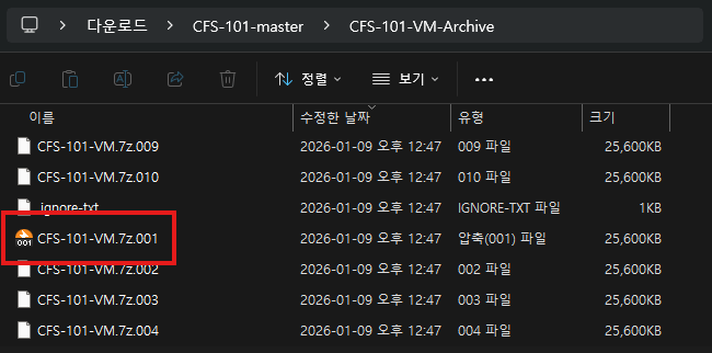 7-Zip을 사용하는 경우, README.txt의 설명대로 CFS-101-VM.zip.001을 우클릭하고 7-Zip → Extract to "CFS-101-VM" 을 차례로 선택해 압축을 해제한다.