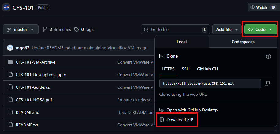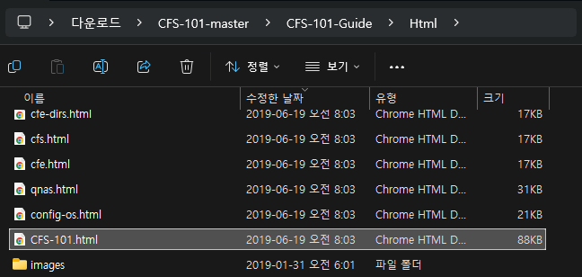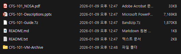 약 5분 정도 소요되며, 이후 CFS-101-master.zip 파일의 압축을 풀고 파일이 잘 다운로드되었는지 확인한다. 이후 README.txt 파일의 지시를 따라 진행한다.