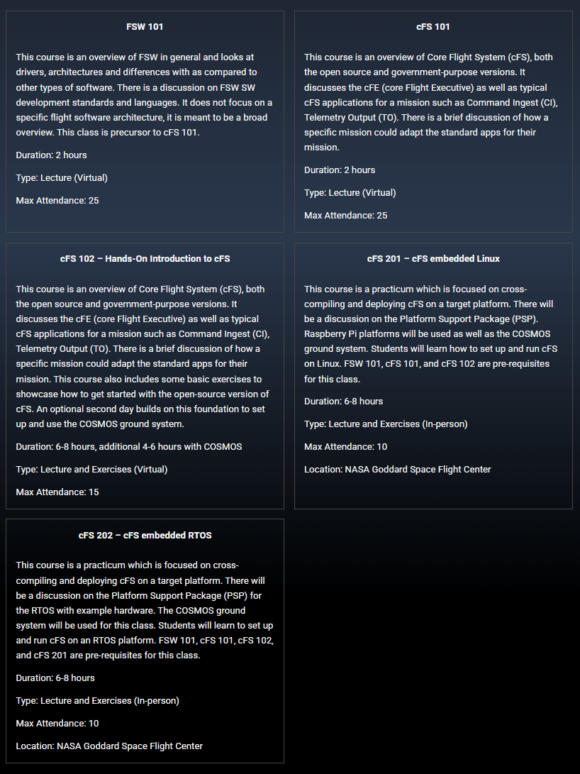 다섯 개의 교육 과정 중 FSW101, CFS101, CFS102는 온라인 세션이며, CFS201, CFS202는 NASA GSFC에서 진행하는 오프라인 세션이다.