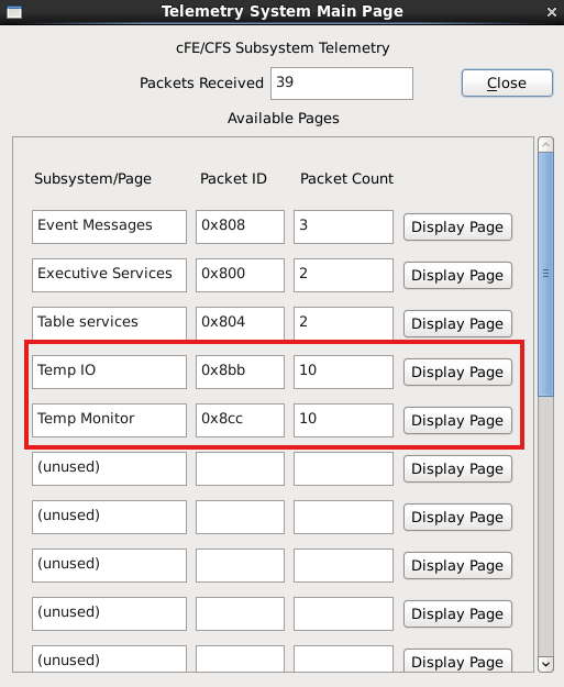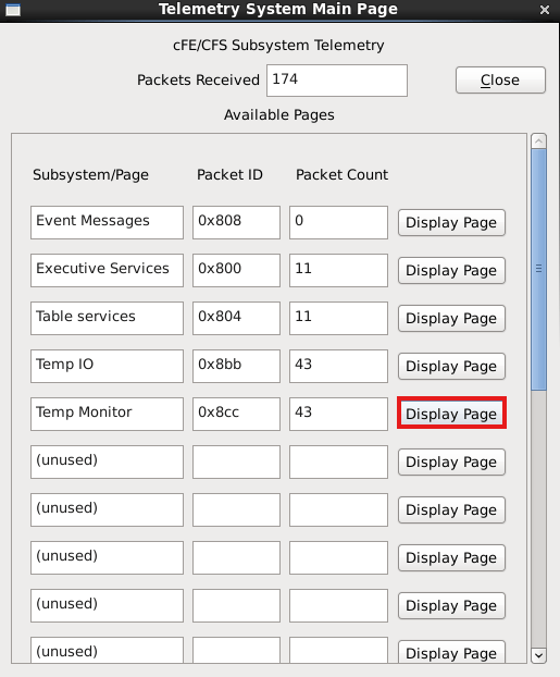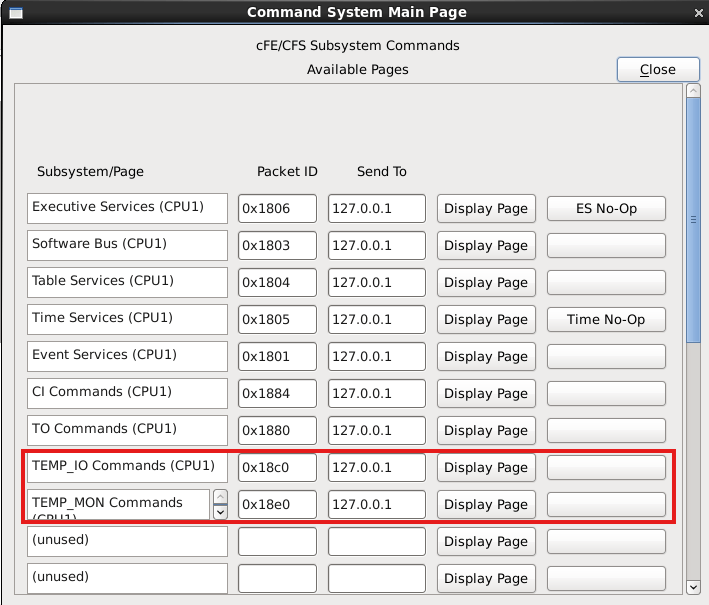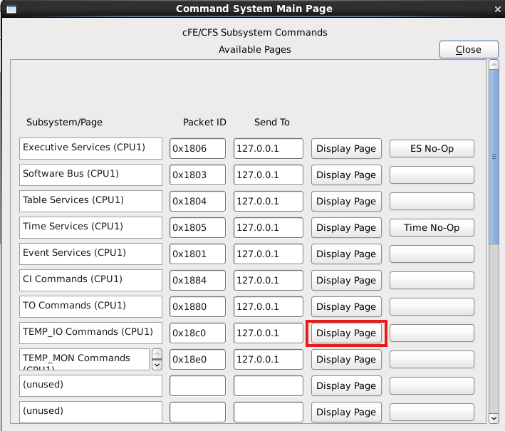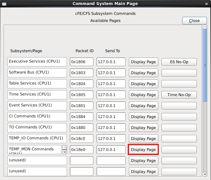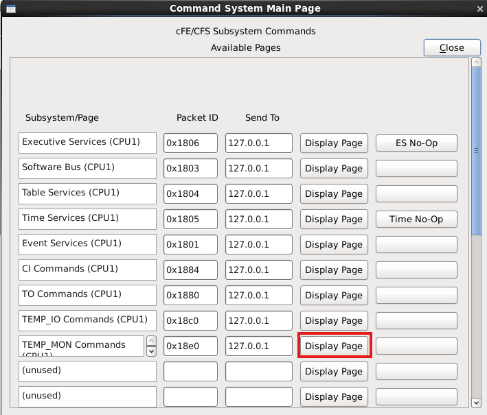 Temp Monitor의 패킷이 제대로 수신되는지 확인하기 위해 Command System에서 패킷을 보내 볼 것이다. 진입하여 TEMP_MON 옆의 Display Page 버튼을 클릭한다.