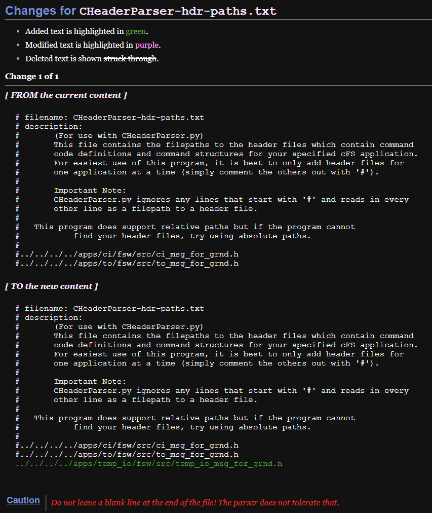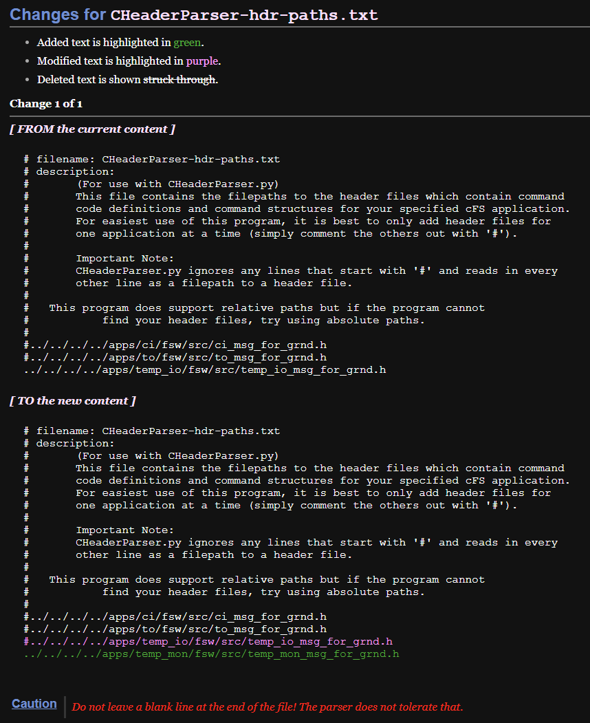 cd /home/dev/Training_workspace/CFS-101/tools/cFS-GroundSystem/Subsystems/cmdGui우리가 사용하게 될 파이썬 스크립트에서 경로를 명확히 파악할 수 있도록 CHeaderParser-hdr-paths.txt 파일을 다음과 같이 수정한다. 이때 파일의 마지막 부분에 빈 라인이 있어서는 안 된다.