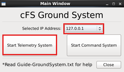 Telemetry System Main Page를 닫고 다시 GroundSystem 메인 페이지로 돌아가면, IP 주소를 선택해서 확인할 수 있는 드롭다운이 있다. 클릭하여 127.0.0.1을 선택한다.