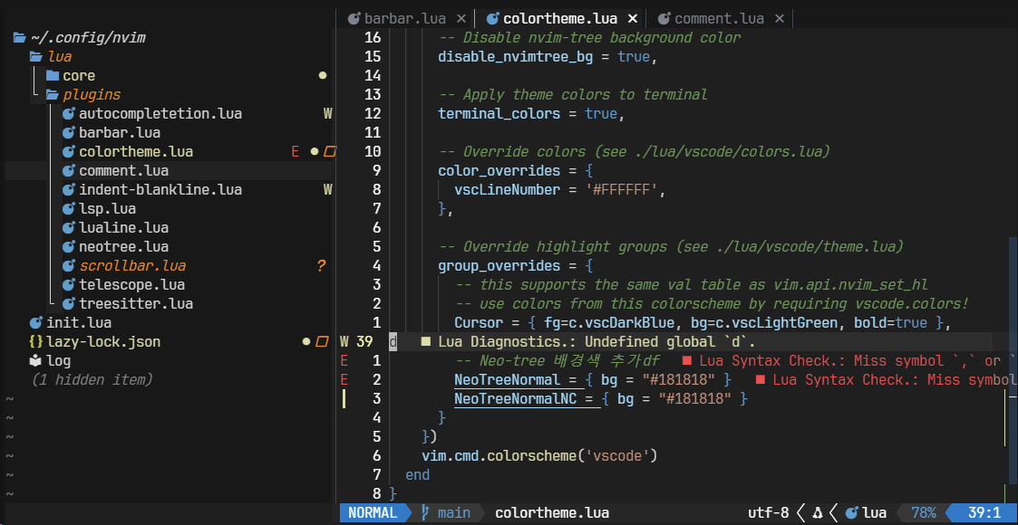},๋ฐ์ํ statusline์ด ์ ์ฉ๋๋ฉด ์ ์ฌ์ง๊ณผ ๊ฐ์ด git ๋ณ๊ฒฝ์ฌํญ๊ณผ lsp ์ค๋ฅ๊ฐ ์์์๋ ์ํ๋ฐ์ ํ์๋์ง ์๋๋ค.