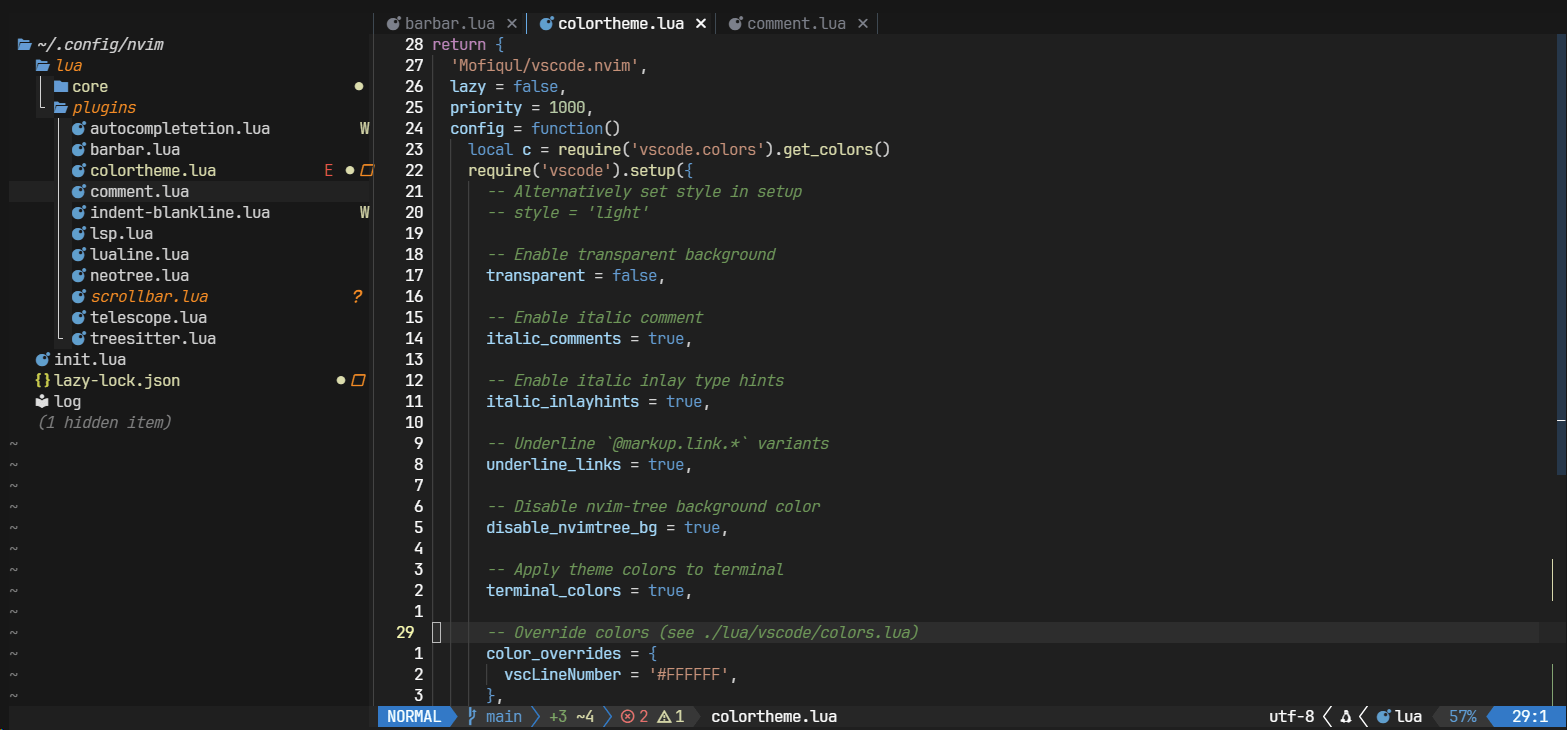 },Bufferline๊ณผ statusline๊น์ง ๊ตฌ์ฑํ๊ณ ๋๋ฉด ์ด ์ ๋์ ํ๋ฉด์ด ์์ฑ๋์์ ๊ฒ! ๐ disabled_filetypes์ ํ์ผํธ๋ฆฌ๋ฅผ ์ถ๊ฐํ๋ค๋ฉด ์ผ์ชฝ ํ๋จ ํ์ ๊ธ์จ๋ ์์ด์ง๋ค.