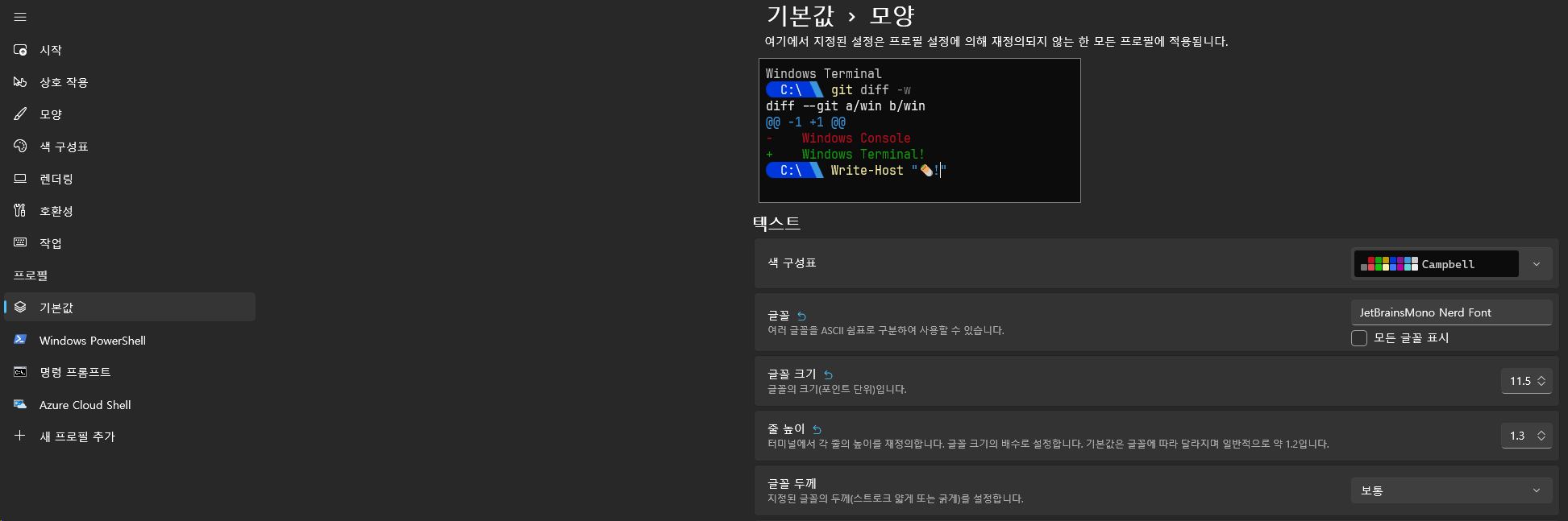 왼쪽 사이드바에서 '기본값'을 선택하고 '모양' 탭에 들어가 글꼴을 JetBrainsMono Nerd Font로 설정해주고, 크기와 높이를 선호에 맞게 조절한다.