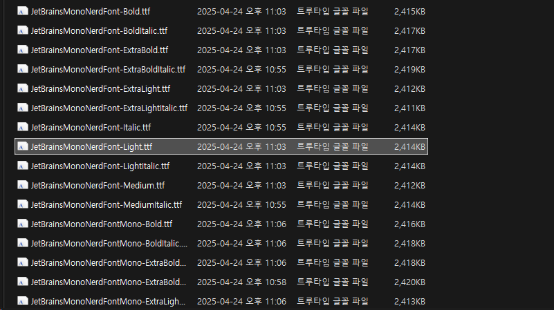 ⚠️주의⚠️: 뒤에 Mono 나 Propo가 붙어 있는 파일이 아닌 JetBrainsMonoNerdFont라고만 되어 있는 파일을 설치할 것! 다른 파일들은 아이콘이 작게 출력되는 문제가 생긴다.